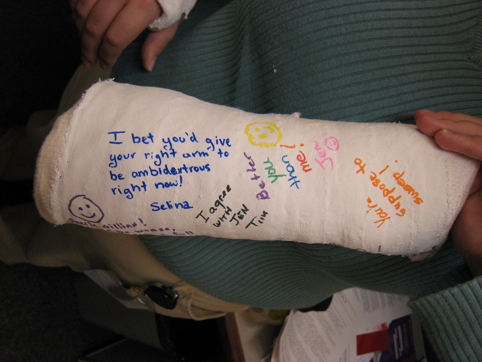 I also had my cast replaced today for a smaller and tighter version. Below are pictures of the old cast...to give you a sense of the fun people have with markers and drinks at the end of a bonspiel! I like the "Curling Queen 07" one myself. ;)
